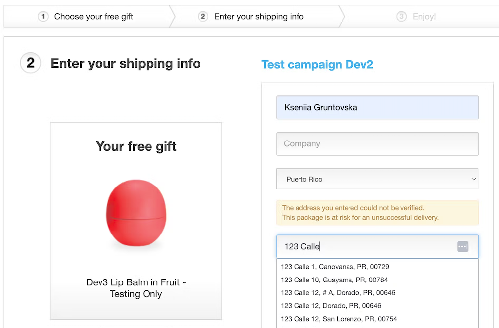 All Printfection shipping address forms now include domestic and international address verification and autocomplete address selection form fields. Users may choose to input an unverified address, in which case the form will display a warning message cautioning the user to select from a verified address.