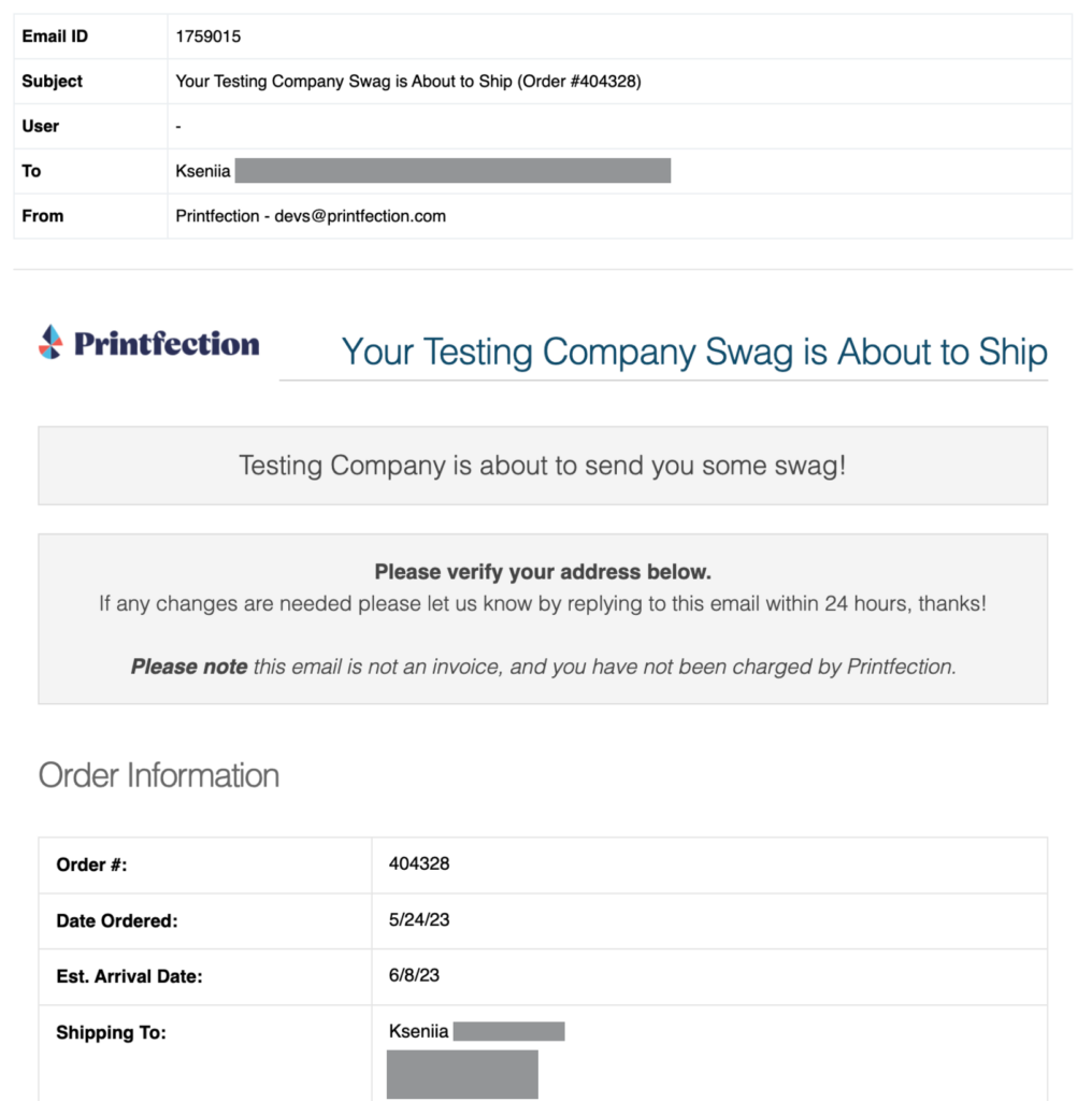 On email notifications to swag recipients, the subject line includes the Printfection name rather than the company name. A new field addition allows for customers to select a new ‘Company Display Name’ which will replace the ‘Printfection’ brand in automated order emails.