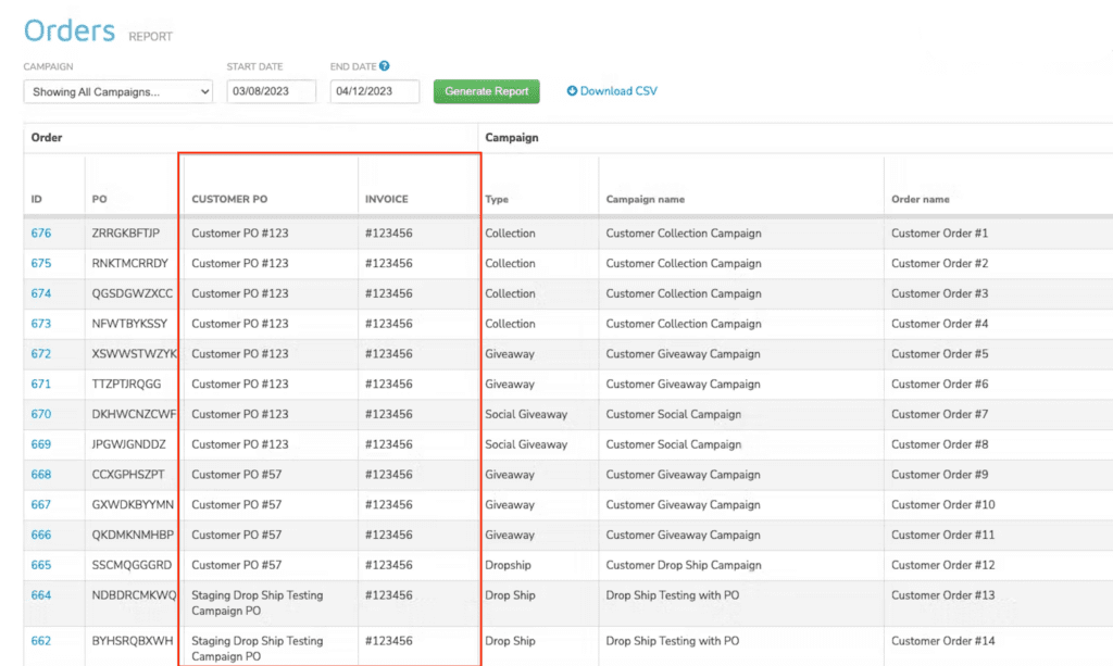 The Orders Report now includes two new columns that display the customer-supplied PO and invoice number when applicable. These additions will make it more efficient for customers and their Accounts Payable teams to reconcile swag purchases.
